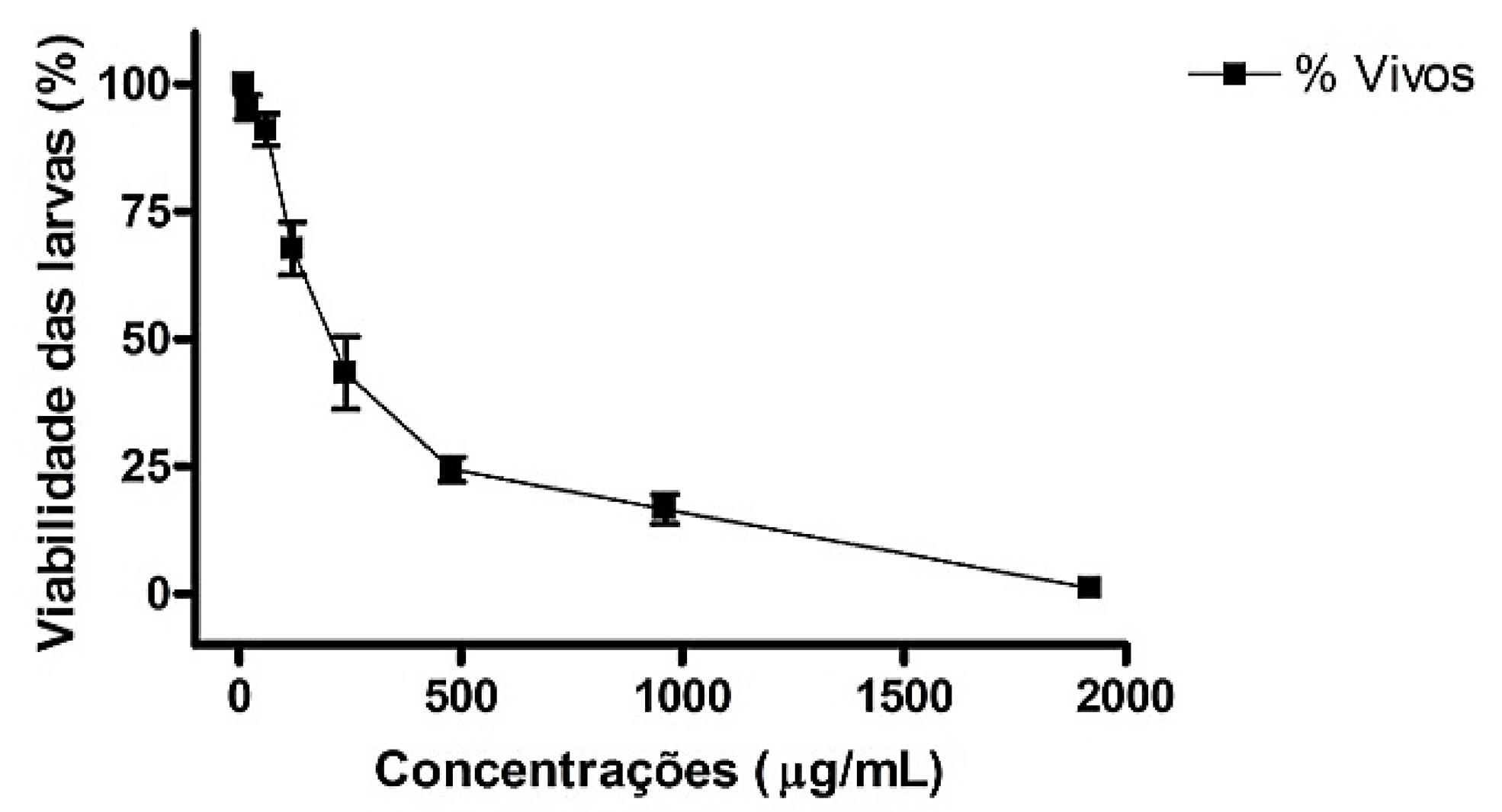 Com dados da FAEc, obteve-se o GRÁFICO 2 e uma CL50 de 1.074,0 (949,6-1.214,0) µg/mL.